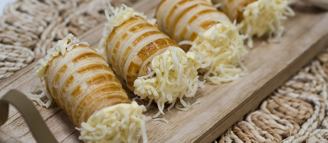 A töltelékhez a tejszínt a sárgájákkal és a sajttal feltesszük főni. Sózzuk ízlés szerint, de ez a krém inkább sós legyen, hiszen még vajjal fogjuk habosítani ha kihűlt. Habzsákból betöltjük a rolókat, két oldalról, majd a végüket reszelt sajtba nyomjuk.