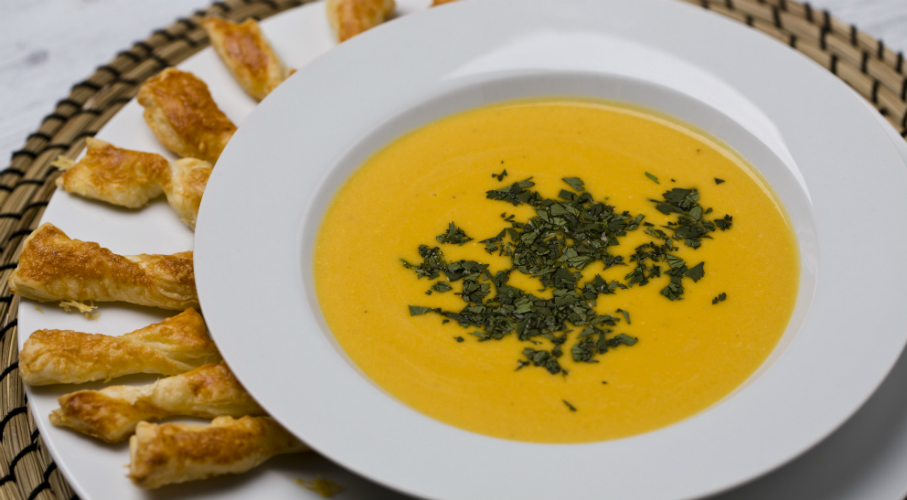 A darabolt sárgarépát, burgonyát, póréhagymát, gyömbért és fokhagymát kevés vaj és olívaolaj keverékén megpirítjuk. Vízzel és alaplével felengedjük. Sózzuk, borsozzuk, majd puhára főzzük. Leveles tésztából tetszőleges formákat vágunk, megkenjük tojással, szórjuk reszelt sajttal és 200 fokos sütőben néhány perc alatt pirosra sütjük. A levest alaposan leturmixoljuk, beforraljuk tejszínnel és a sajtos ropogóssal tálaljuk.