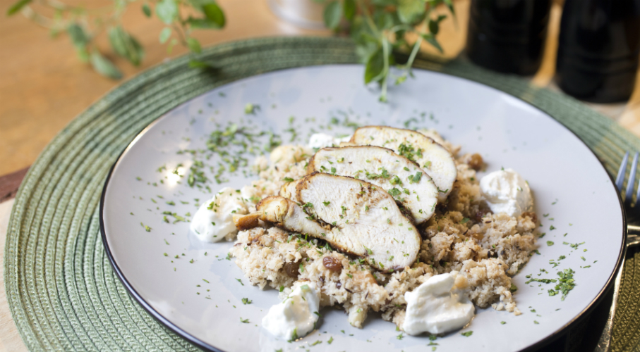 A csirkemellet kettévágjuk, sózzuk, borsozzuk és 1 bedörzsöljük a fűszerkeverékkel. Forró serpenyőben vaj és olívaolaj keverékén, a befűszerezett csirkemelleket 30 másodpercenként megfordítva sütni kezdjük, egészen addig amíg kérget nem sütünk rájuk, miközben a belsejük nem készül még el teljesen (ehhez összesen kb. 2-2 percig kell őket sütni oldalanként). A csirkét a serpenyővel együtt 130 fokos sütőbe tesszük, és 15-20 percig sütjük. A karfiolt rózsáira szedjük és késes aprítógépben egészen finomra aprítjuk. Egy száraz, forró serpenyőbe beleszórjuk az egész római köményt és a fekete mustármagot és addig hevítjük, míg illatozni nem kezd. Rádobjuk a vajat, hagyjuk felolvadni és finoman megbarnulni. Hozzáadjuk a mandulát, hagyjuk kissé lepirulni, majd jöhet a finomra aprított karfiol. Sózzuk és gyakran kevergetve megpároljuk, majd megsütjük. Frissen őrölt borssal ízesítjük és hozzáadjuk a mazsolát is.