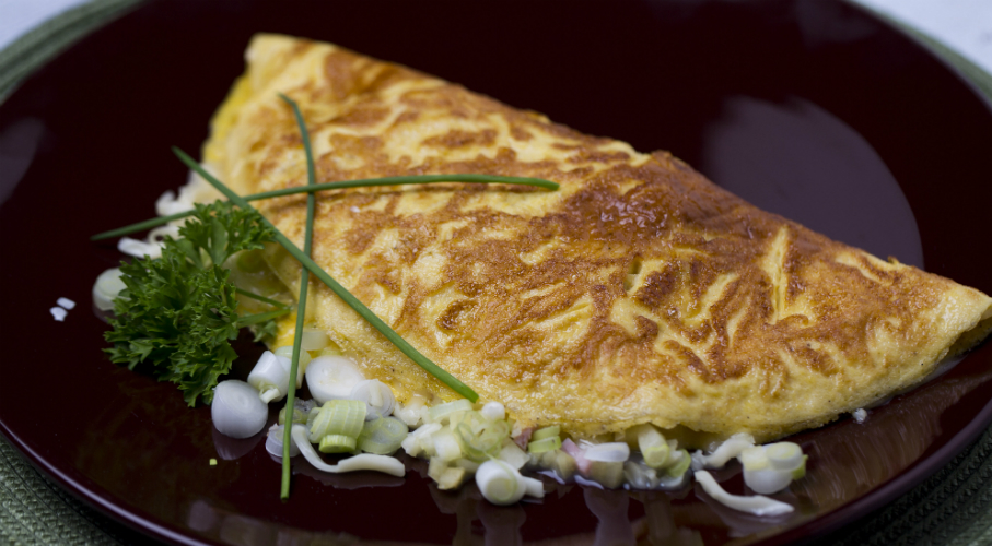 A tojást a tejszínnel alaposan felverjük, sózzuk, borsozzuk. Vajat kevés olajjal serpenyőben felmelegítünk, ebbe öntjük a tojást és csak az alsó felét sütjük meg. Beletesszük a darabolt főtt sonkát, a sajtot, az újhagymát és a paprikát. Összehajtjuk és tálaljuk.