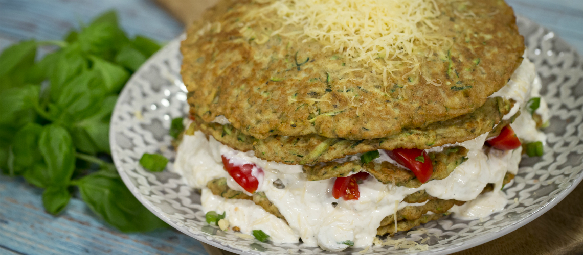 A palacsintatésztához a cukkinit durvára reszeljük, és hozzákeverjük a többi összetevőt. A tészta akkor jó, ha az állaga laza, enyhén folyós. Forró serpenyőben aranyszínűre sütjük a palacsintákat, majd hagyjuk kihűlni. Elkészítjük a krémet, melyhez egy tálban összekeverjük a görög joghurtot, a zúzott fokhagymát és a durvára reszelt sajtot. A cherry paradicsomot félbevágjuk, az újhagymát vékony karikákra szeleteljük, és a joghurtkeverékhez adjuk, majd megsózzuk és zöldfűszerekkel ízesítjük. A kihűlt palacsintákat rétegezzük, minden réteg tetejét megkenjük a joghurtos-zöldfűszeres krémmel. Egy kevés paradicsommal és újhagymával díszítjük.