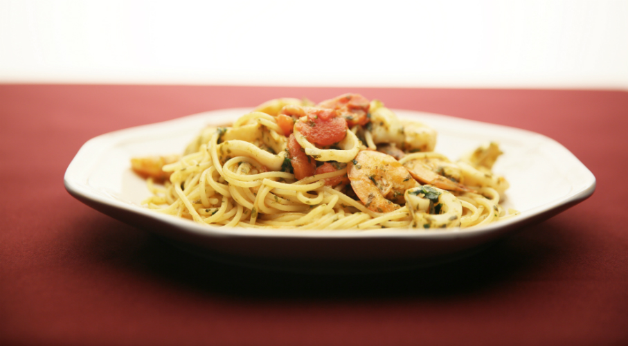 Feltesszük főni a spagettinek a vizet, amit alaposan megsózunk, ha felforr, beletesszük a spagettit. Egy serpenyőben megpároljuk olívaolajban az apróra darabolt fokhagymát és petrezselymet. Hozzáadunk egy keveset a tészta főzővizéből, utána hozzáadjuk az alábbi sorrendben a tenger gyümölcseit: először a tintahalkarikákat, utána a tintahal szeleteket, végül a rákot. Ráöntjük a száraz fehérbort, sózzuk, borsozzuk, és lassú tűznél fedő alatt hagyjuk pár percig párolódni. Hozzáadjuk az apróra darabolt paradicsomot, és tovább pároljuk. Félkész állapotban rászedjük a tésztát a szószra. Megszórjuk jó sok aprított petrezselyemmel, és a szósszal együtt pár perc alatt készre főzzük.