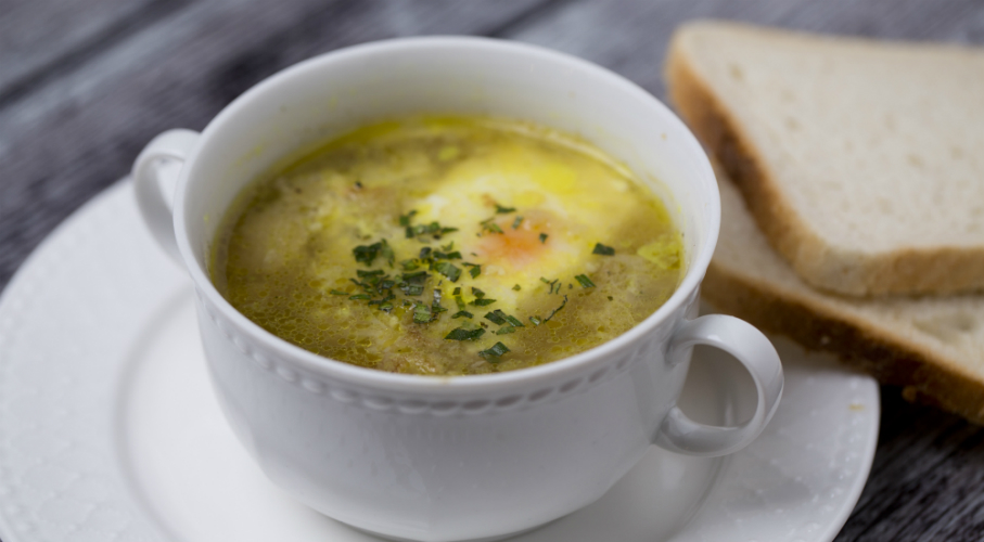 A kenyeret felkockázzuk és egy mélyebb edényben, forró olívaolajon megpirítjuk. A fokhagymagerezdeket kinyomkodjuk és a levével együtt a pirított kenyérkockákra rakjuk és felöntjük az alaplével. Sózzuk, borsozzuk, lefedjük és 20 percig főzzük. A sütőt 200 fokra előmelegítjük. A levest négy hőálló csészébe öntjük és egy-egy tojást ütünk bele. 15 percre az előmelegített sütőbe tesszük, ez alatt a tojás kissé megdermed.