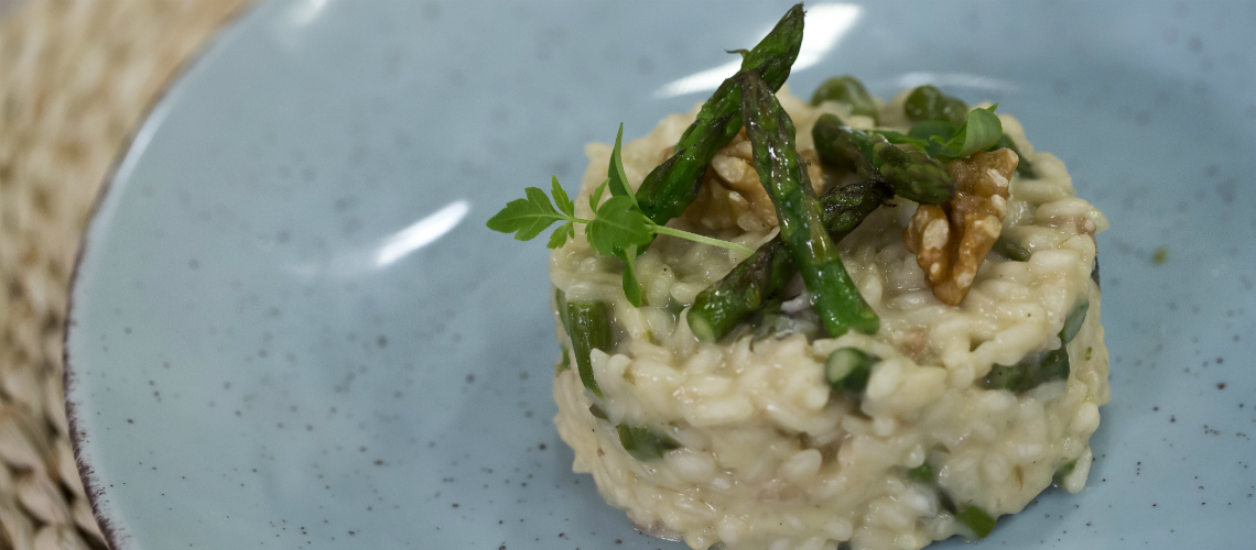 A diót apróra vágjuk, néhány darabot nagyobbra hagyunk a díszítéshez. Megtisztítjuk és karikákra vágjuk a spárgát, a csúcsos részét nagyobbakra hagyjuk, hosszában vágjuk el. A hagymát is felaprítjuk és kevés olívaolajon megpároljuk, majd fehérborral felöntjük. Amikor a hagymának krémes állaga lesz, hozzáadjuk a rizst és főzzük. Kb. 10 perc után hozzáadjuk a gorgonzolát is. Amikor elkészült a rizs, elzárjuk alatta a tüzet, vajat adunk hozzá és tálalunk.
