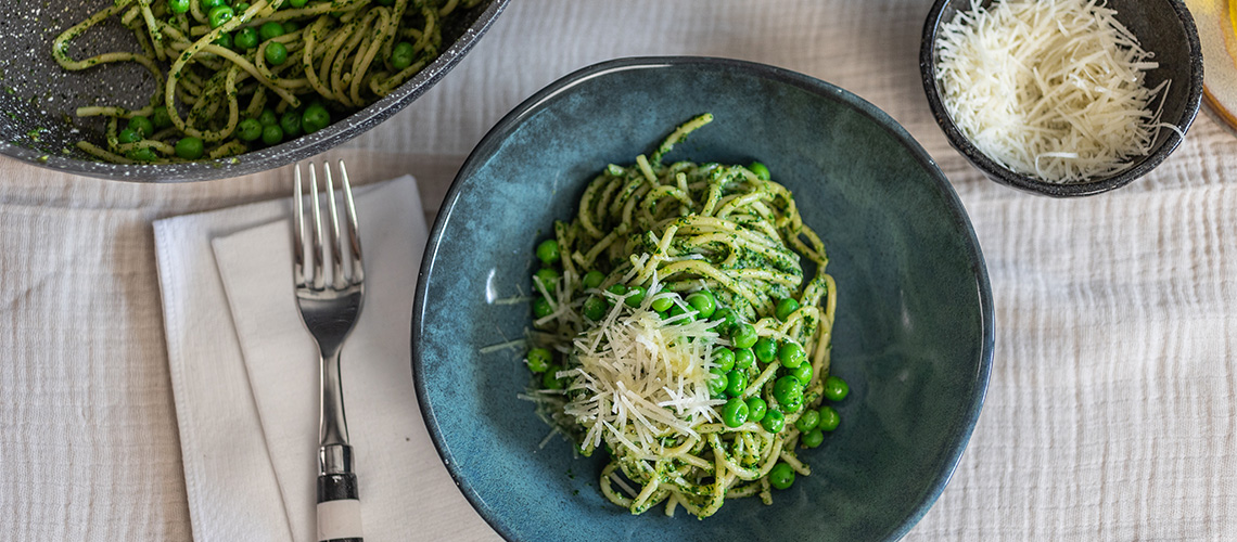 Frissen reszelt parmezánnal, párolt zöldborsóval vagy akár pitypang szirmokkal megszórva tálaljuk.