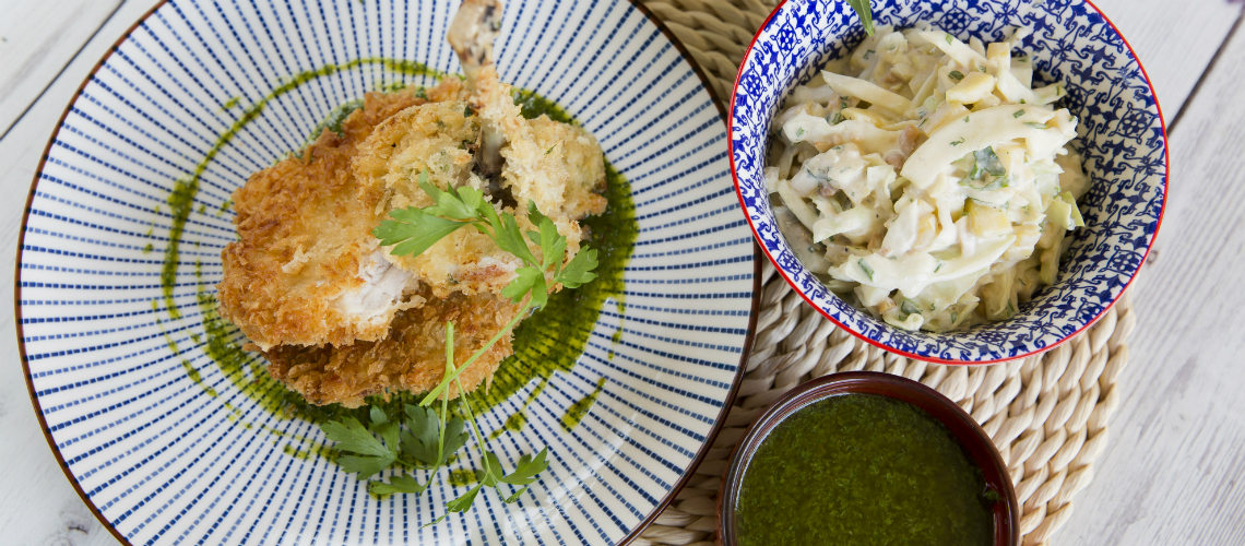 Sült csirke panko morzsában thai salátával, mangóval és fűszeres káposztával