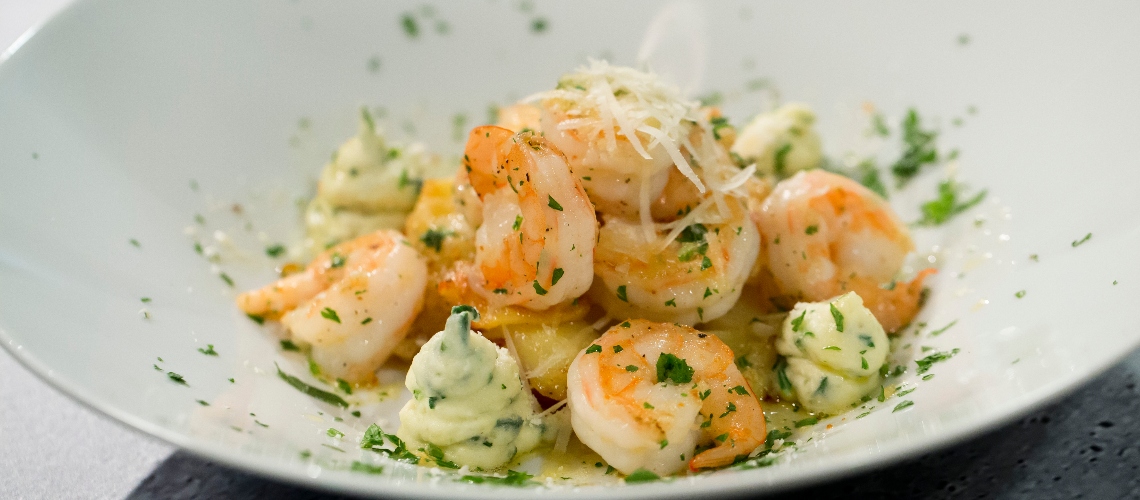A garnélákat megtisztítjuk. A vajat egy mélyebb serpenyőben felolvasztjuk, beledobjuk a garnélákat pár percig főzzük. Ahogy opálosodni kezd kész is. Közben a fokhagymás keverékkel kenegetjük.