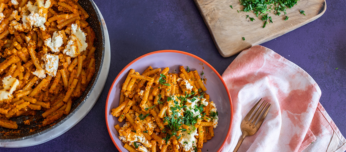 A mogyorót serpenyőbe tesszük, megpirítjuk, majd tiszta konyharuhával ledörzsöljük a héját. A mogyorót a paprikával, fokhagymával késes aprítógépbe tesszük és finomra daráljuk. Közben folyamatosan adagoljuk hozzá az olíví olajat. Az ecettel, parmezánnal és bazsalikommal is összedolgozzuk. Összeforgatjuk a tésztával, átmelegítjük és ha kell, egy kevés tészta főzőlével lazítjuk. A végén rámorzsoljuk a sült feta sajtot és azonnal tálaljuk.