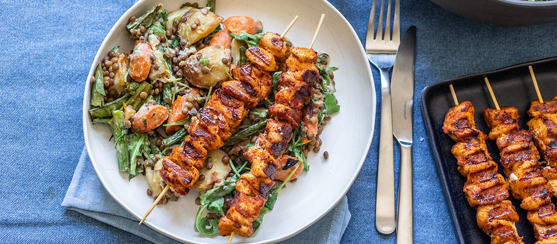 Tálaláskor a salátát összeforgatjuk az öntettel és ráhelyezzük a fűszeres nyárskat.