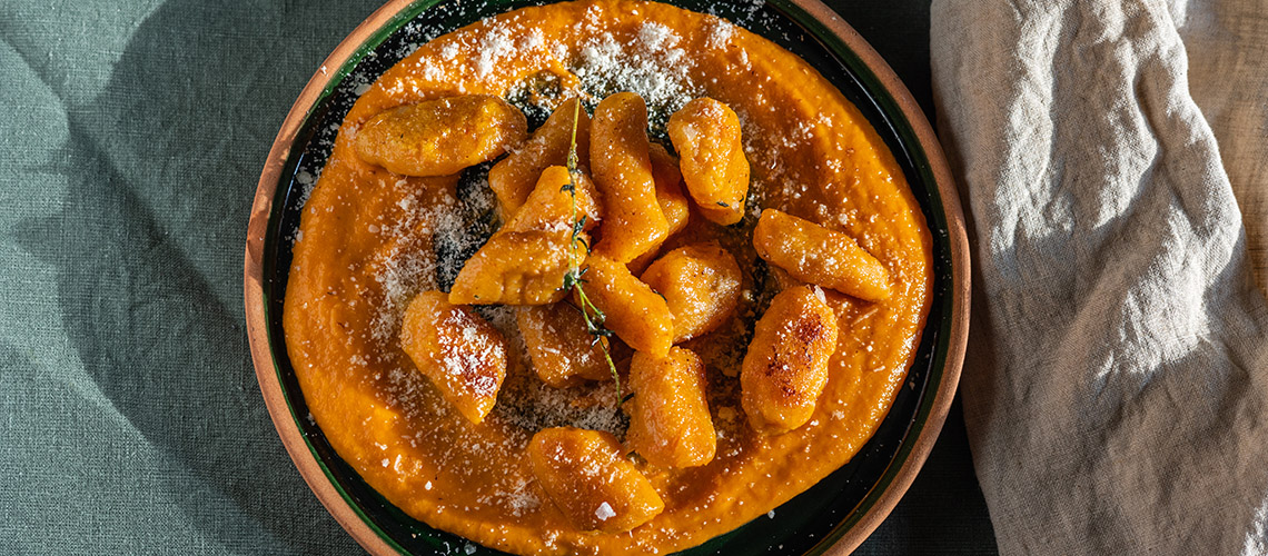 A mártás hozzávalóit összeturmixoljuk, felmelegítjük és beleforgatjuk a pirított gnocchit.