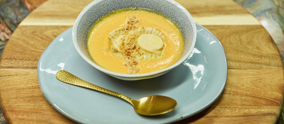 Az olivaolajon elindítjuk az apróra vágott vöröshagymát, és ha szeretjük, egy pici fokhagymát. Rátesszük a sütőtököt és az édesburgonyát, felengedjük az alaplével. Sózzuk, borsozzuk. 10 perc forrás után hozzáadjuk a tejszínt, majd megadjuk a végső fűszerezést… chili, szerecsendió, ki mit szeret. A levest krémesre turmixoljuk.