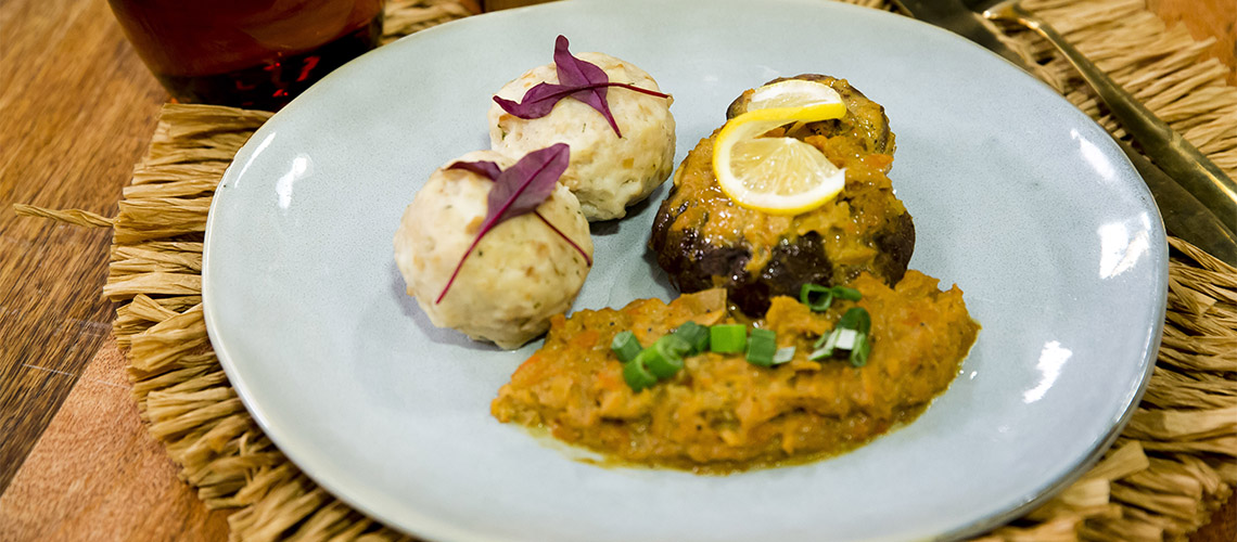 A gyorsfagyasztott zsemlegombócot a csomagolás szerint elkészítjük, majd a vadas mártásba visszatett szarvas szeletekkel tálaljuk, ízlés szerint még egy kevés citromlével vagy balzsamecettel díszítve.