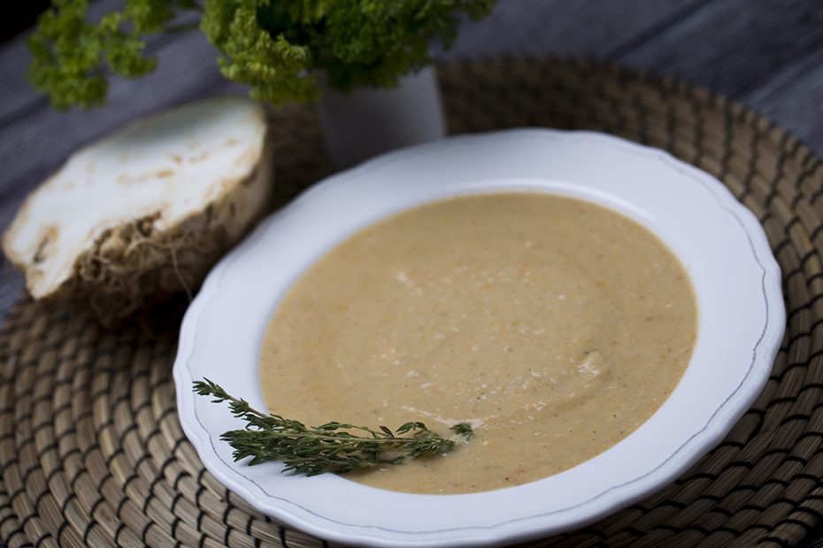 A vajon megfuttatjuk a hagymát és a fokhagymát, ezután beletesszük a krumplit, a zellert, egy pici rozmaringot és zsályát, felöntjük vízzel, és körülbelül fél órát főzzük. A végén teszünk bele tejszínt és szerecsendiót. Turmixgépben összeturmixoljuk, és krutonnal tálaljuk.