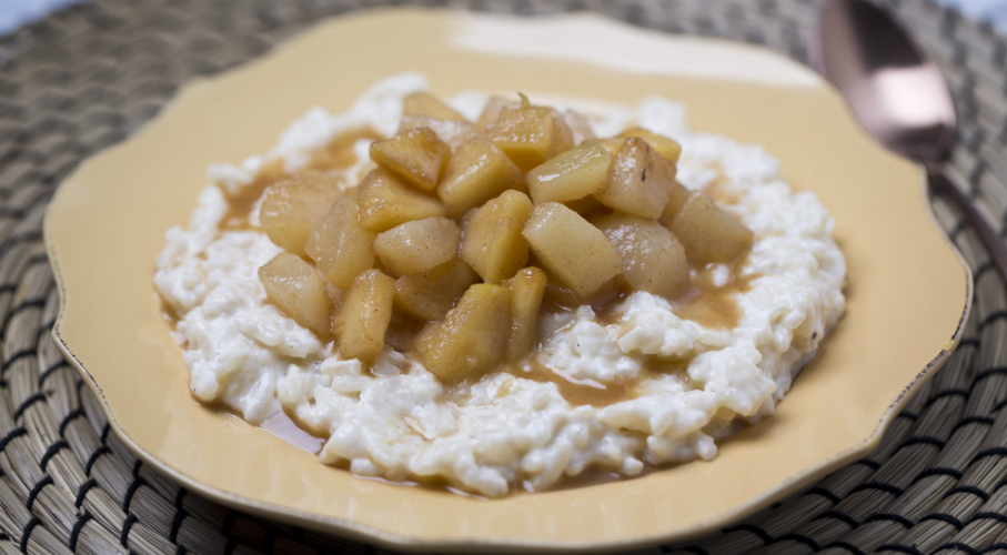 A rizst feltesszük főni vízben, majd ha a víz elfőtt, apránként hozzáadjuk a tejet, míg a rizs meg nem puhul. Ha kész, hozzáadjuk a cukorral és vanília őrleménnyel elkevert tojássárgáját. Az almát és a körtét meghámozzuk és felkockázzuk, citromos vízbe áztatjuk. Ha leszűrtük, összemelegítjük a vajjal, a barna cukorral és a fahéjjal. Összeforraljuk.