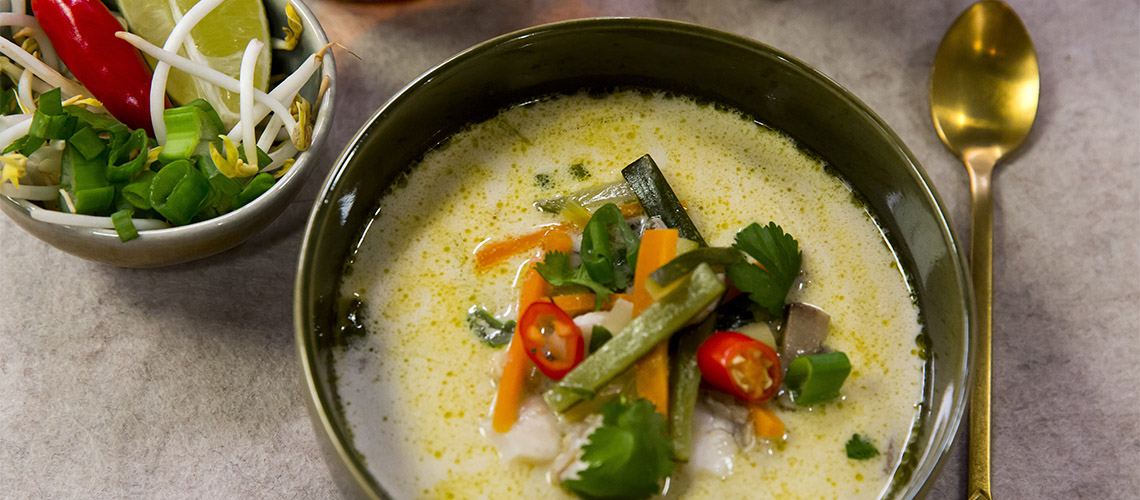 Amikor felforrt a leves beletesszük a kockára vágott süllőfilét és kb. 3-4 percig főzzük, amíg teljesen megfő. Ha kész, hozzáadjuk a lime levét, az újhagyma zöldjét és a felkarikázott chilipaprikát. Lime-szeletekkel, chili paprikával és mungóbab csírával tálaljuk.