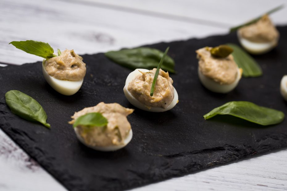 Megfőzzük, és megpucoljuk a fürjtojásokat. A tojássárgájukat robotgépbe tesszük, a kapribogyóval, a tonhallal, a görög joghurttal, valamint a majonézzel együtt, és alaposan összekeverjük. A fürjtojásokat megtöltjük ezzel a krémmel, és ízlés szerint zöld fűszernövényekkel díszítve tálaljuk.