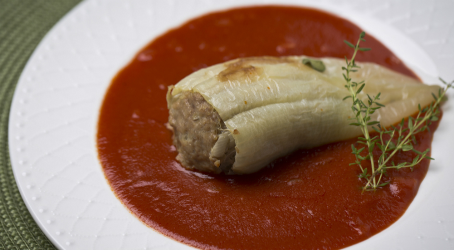 A sertéshúshoz adjunk 1/2 kanál cukrot, sót, 100 ml vizet, és alaposan összekeverjük, majd a hűtőben másnapig pihentetjük a keveréket. Másnap hozzáadjuk a tojást, zsemlemorzsát, réteslisztet, a finomra vágott hagymát, zúzott fokhagymát, megszórjuk borssal, és egy kevéske csemege paprikával és friss oregánóval. Az egészet összekeverjük, és betöltjük a kierezett paprikákba, majd sütőtálba tesszük, felöntjük vízzel és 180 °C fokon kb. 30 percig sütjük. A zsírból és finomlisztből rántást készítünk, hozzáadjuk a finomra vágott hagymát, babérlevelet, szegfűborsot, szemes borsot, csipetnyi sót és egy kevéske cukrot. Összekeverjük és felöntjük a paradicsomlével és hozzáadjuk a paradicsompürét. A fűszereket tehetjük egy teatojásba, hogy könnyebb legyen kiszedni a kész szószból. Az egészet összekeverjük, felöntjük vízzel és főzzük. Amikor kész, szükség szerint szitán átszűrjük, hogy különösen sima legyen a szósz.