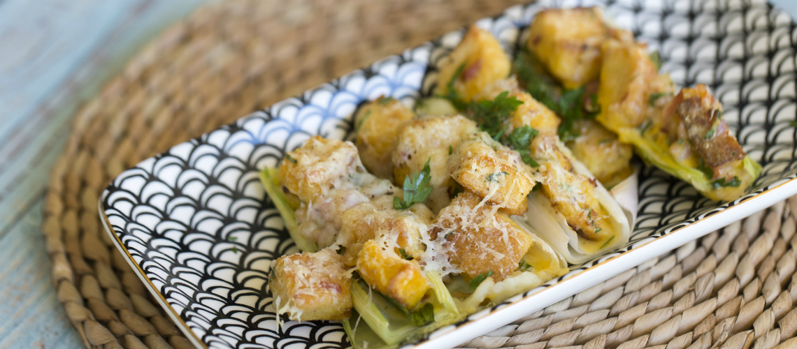 Tölteléket készítünk a pirított kenyérből, tejszínből, tojásból fűszernövényekből, szalonnából és a sült belső póréból. A póréhagyma külső részeit ezzel a töltelékkel megtöltjük, sajtot reszelünk rá. Megöntözzük olajjal és fehérborral, 200 fokos előmelegített sütőben megsütjük, félidőben sajtot és igény szerint alaplevet teszünk rá.