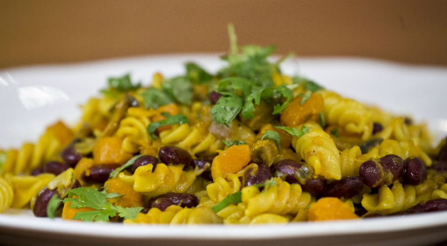 Az átöblített fusilli-t sós vízben „al dente”re főzzük. Egy forró serpenyőbe olajon megpirítjuk a lilahagymát és a fokhagymát. Hozzáadjuk a gyömbért, sót, borsot és kurkumát. Megpirítjuk, majd fokozatosan hozzáadjuk a sütőtököt, a babot és a gombát. Legvégül elkeverjük a fusillivel és parmezán forgáccsal tálaljuk.