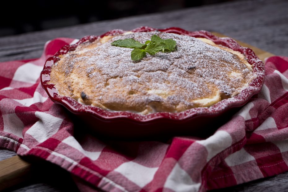 Egy kerek formát alaposan kikenünk vajjal. Egy tálba töltjük a tejszínt, a tejet és összekeverjük a vaníliás cukorral. A kiflit, vagy kalácsot szeletekre vágjuk és a tejszínes keverékbe áztatjuk. A forma aljára teszünk egy réteg beáztatott péksüteményt és elkészítjük a túrós tölteléket. A túrót összekeverjük a tojások sárgájával, cukorral (a cukrot ízlés szerint adagoljuk), vaníliás cukorral és citromhéjjal. A túrós keveréket a péksüteményre rétegezzük a formába, majd ráhelyezzük a sárgabarackot, vagy más gyümölcsöt, pl. almát vaníliás cukorral, mazsolával. Lefedjük egy réteg beáztatott péksüteménnyel. Ha magasabb a forma, akkor tovább rétegezhetjük a hozzávalókat. A rakott zsemlét kb. 30 percig sütjük 180 °C fokos sütőben, míg a teteje aranybarna lesz. Ezután kivesszük a sütőből, vajforgácsokkal megszórjuk és a 3 tojásfehérjéből vert habbal bekenjük a tetejét, majd tovább sütjük, míg szép aranybarana lesz.