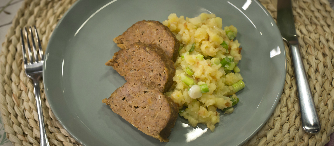 A burgonyát sós vízben puhára főzzük, leöntjük a vizet és összetörjük. Ezután belekeverjük a vajon megpirított hagymát, sózzuk, borsozzuk és hozzáadjuk az újhagymát.