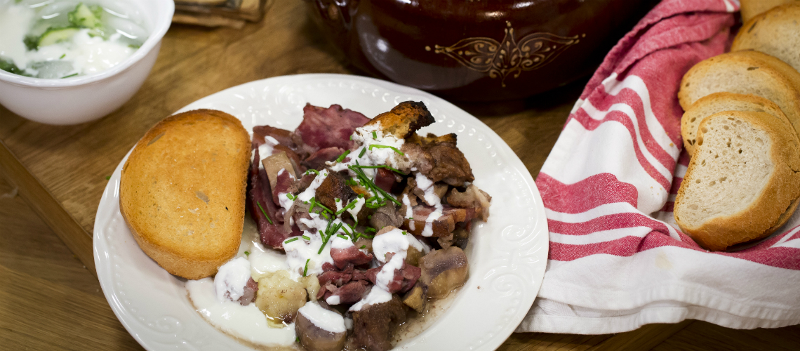 A bárányhúst apró darabokra aprítjuk, megsózzuk, borsozzuk és lábasban izzított hagymás zsíron megpároljuk. Ezután kizsírozott cserépfazék alját szalonnaszeletekkel kirakjuk. Erre egy sor húst, egy sor vajban párolt gombát helyezünk, amit meghintünk zsemlemorzsával. Ráöntünk kb. fél liter vörös bort. Fedővel lefedjük és kb. 45 percig forró sütőben sütjük.