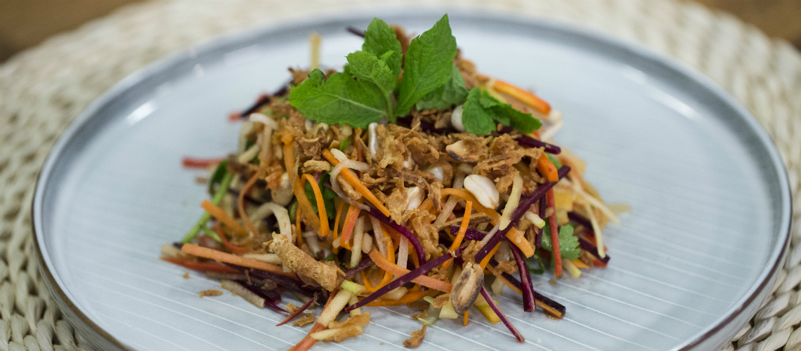 Az összes alapanyagot összekeverjük. Amikor megkóstoljuk, túl töménynek fog tűnni, de nem baj, mert a saláta hamar felveszi az öntet ízeit.