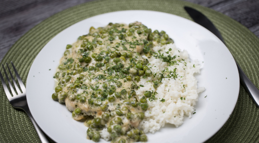 A rizst megpároljuk kétszeres mennyiségű vízben. Egy serpenyőben vajat olvasztunk, a karajszeletek széleit bevagdossuk és besózzuk. A hússzeleteket lisztbe forgatjuk és a forró vajban kisütjük, kissé lepirítjuk. Ha kész, hozzáadjuk a zöldborsót, a tejszínt és egy csipet cukrot. Megsózzuk és megszórjuk a vágott petrezselyemmel. Lefedve pár percig pároljuk.