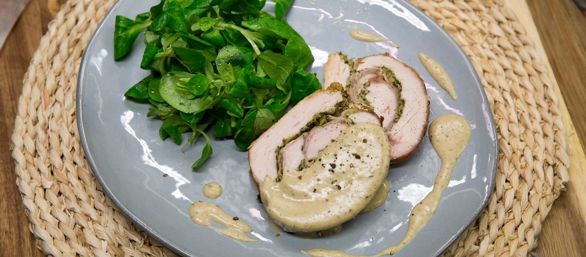 A pulykamellet előkészítjük a klopfoláshoz – a vastagabb részt apró bevágások segítségével kihajtjuk, hogy egyenletes vastagságú legyen a filé. Fóliát helyezünk rá, és kb. másfél centiméter vastagra klopfoljuk. Eltávolítjuk a fóliát, enyhén átsózzuk a húst és elterítjük rajta a pesztót. Erre kerülnek a főttsonka-szeletek, és azokra parmezánt reszelünk. Minél szorosabban feltekerjük a húst, alaposan átkötözzük és az így kívülre került oldalát is sózzuk. Tepsibe helyezzük, egy kevés alaplét öntünk mellé és 180 fokos sütőben 45 perc alatt készre sütjük.