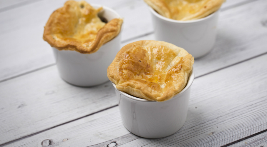 A vékony csíkokra vágott csirkemellet kevés olajon a szeletelt póréhagymával együtt megpirítjuk. Hozzáadjuk az apóra vágott gombát, sózzuk, borsozzuk és néhány szál friss kakukkfűvel fűszerezzük. Hozzáadjuk a külön forrázott, rózsáira szedett brokkolit és félre tesszük hűlni. Kevés dijoni mustárral és tejföllel kikeverjük, enyhén vajazott szuflé formákba tesszük, melyeket leveles tészta lapokkal takarunk le. 170 fokos sütőben néhány perc alatt pirosra sütjük.
