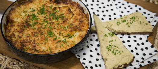 Rác rakott lecsó (gyuvecs) burgonyás padlizsánpürével