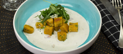 Répakrémleves gyömbérrel, tejföllel, tökmagos pesztóval