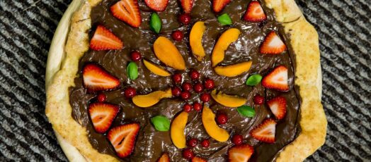 Édes pizza – gyors tészta diós és csokoládés (Nutella) krémmel, banánnal és eperrel.