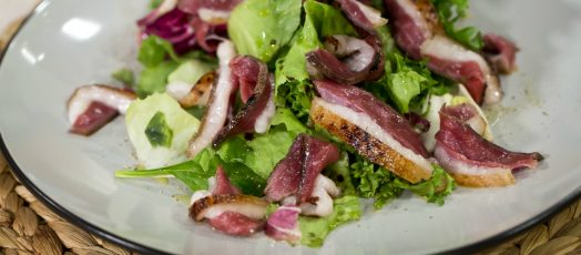 Tárkonyos vajas sültcsirkecomb szalonnás túrógombóccal