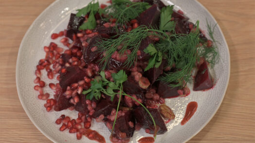Flank stake karamellizált sütőtökkel, színes céklákkal, kecskesajttal és eper pürével marinált salottahagymával