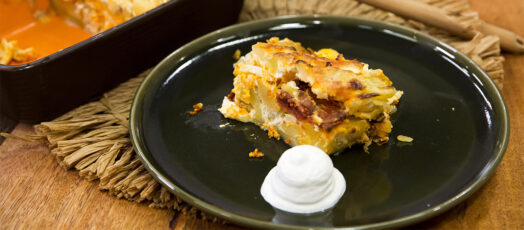 Dödölle, tavaszi hagyma saláta, mangalica szalonna, tejföl
