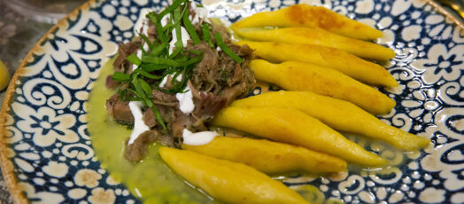 Bárányhúsos egytálétel, medvehagymás schufnudlival (sváb sodort nudli), borsos szósszal