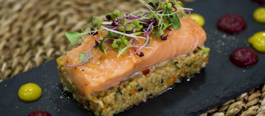 50 fokon confitált lazac,citrusos-zöldséges bulgurral