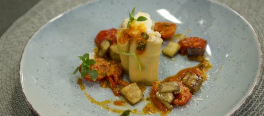 Ordával és sült padlizsánnal töltött paccheri tészta burattával