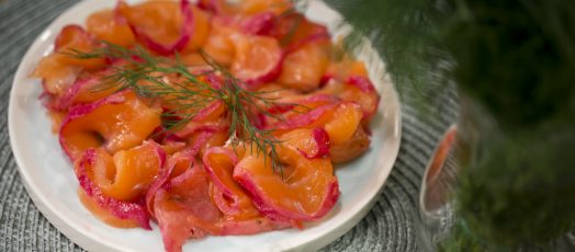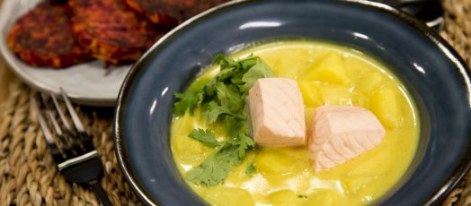 Curry-s kókusztejes krumplifőzelék, sütőtökös cékla rösztivel, posírozott lazac